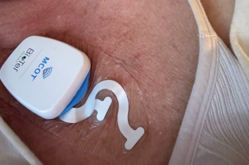 I don’t know if any of you have worn a halter monitor with the leads attached to your chest with the wires all over. It all connects to a device, it’s bulky, and the leads come off all the time. It was messy.